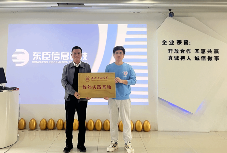 刘宏兵院长代表信息工程学院,将“实践教学基地”牌匾授予东臣科技李胜经理。这一仪式的完成,标志着双方在人才培养、资源共享、产学研合作等方面达成深度共识。此次与东臣科技共建实践教学基地,是深化产教融合的重要举措,希望通过校企双方的密切合作,让学生在真实项目场景中锤炼专业技能、积累行业经验,同时也为企业输送更多高素质应用型人才。