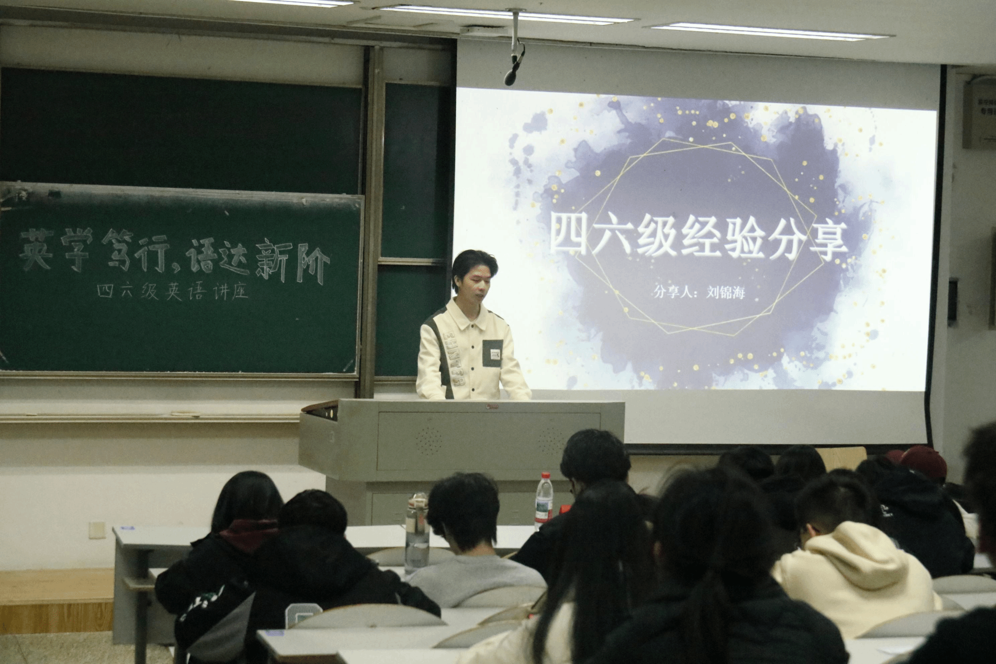 讲座伊始,主讲人详细介绍了四六级考试的时间安排与流程,明确了12月13日的考试时段及各环节注意事项,帮助同学们建立清晰的备考时间观念。随后,他们围绕考试内容与结构展开讲解,针对写作、听力、阅读理解和翻译四大模块的题型特点、分值分布进行拆解,结合自身经验分析了各模块的备考重点与难点。