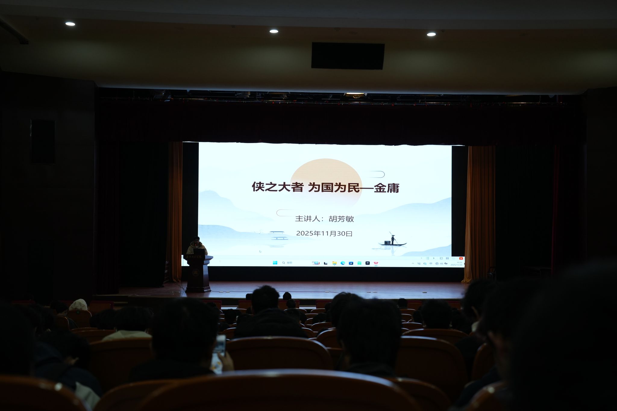2025年11月30号晚,信息工程学院全体大一新生齐聚第二报告厅参与嘉禾名人讲堂,信息工程学院团委书记胡芳敏老师以“侠之大者,为国为民”为题,讲授嘉兴名人——金庸的故事。带领大家走进金庸武侠世界,探寻武侠世界的侠义真谛,令在场的同学们收获满满,意犹未尽。